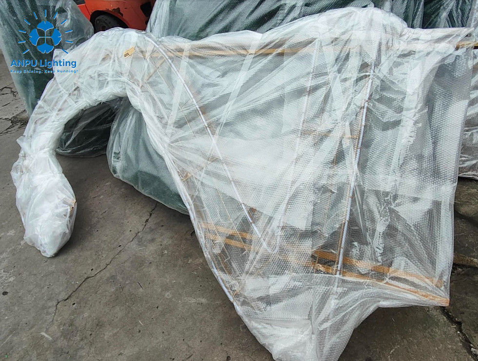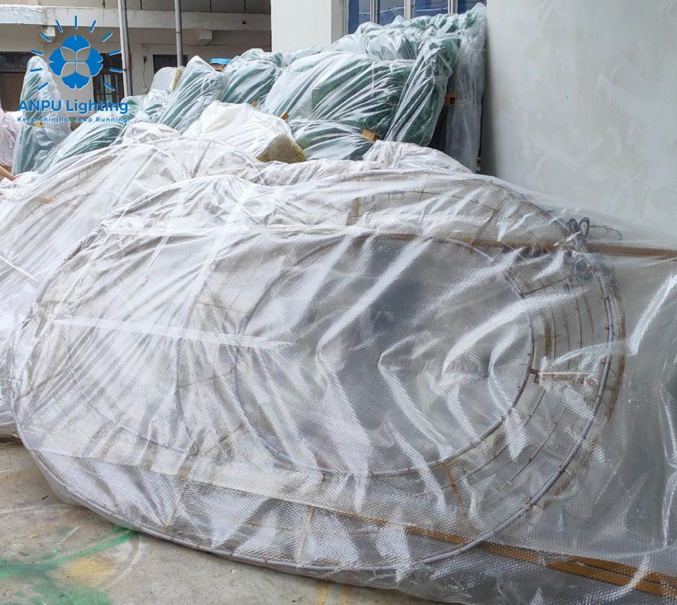 Cada lámpara escultural ANPU, incluyendo nuestra lámpara Grand Gift Box y las bolas navideñas para exteriores, se envuelve meticulosamente en plástico de burbujas protector de alta calidad. Esto garantiza que su delicada y, a menudo, grande pieza llegue en perfectas condiciones, protegiendo su diseño único de los riesgos del transporte.