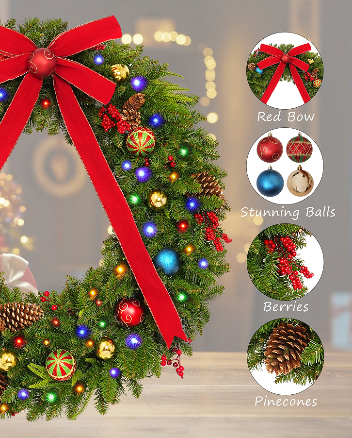 Ultimate Customization: Our Flame Retardant Pre-lit Wreath offers total flexibility. You can select exact sizes (24" to 84"), custom decorations like snowflakes and candy canes, and advanced lighting from warm white to point-control RGB.